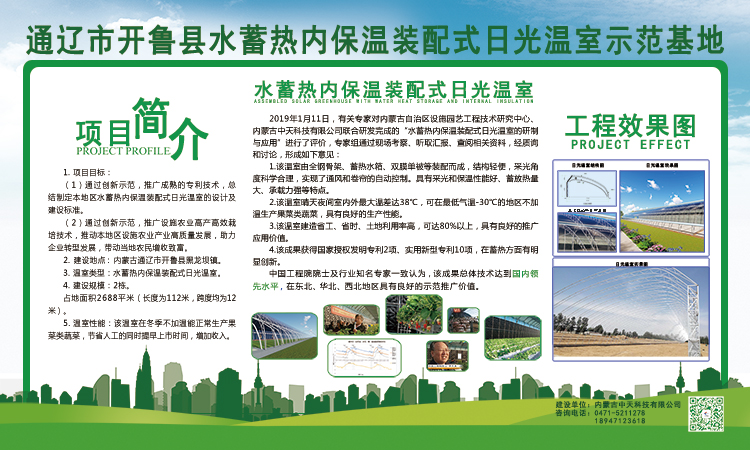 1.通過創(chuàng)新示范,推廣成熟的專利集成技術(shù)及產(chǎn)品,總結(jié)制定內(nèi)蒙古通遼市及周邊地區(qū)水蓄熱內(nèi)保溫裝配式日光溫室的設(shè)計及建設(shè)標準。