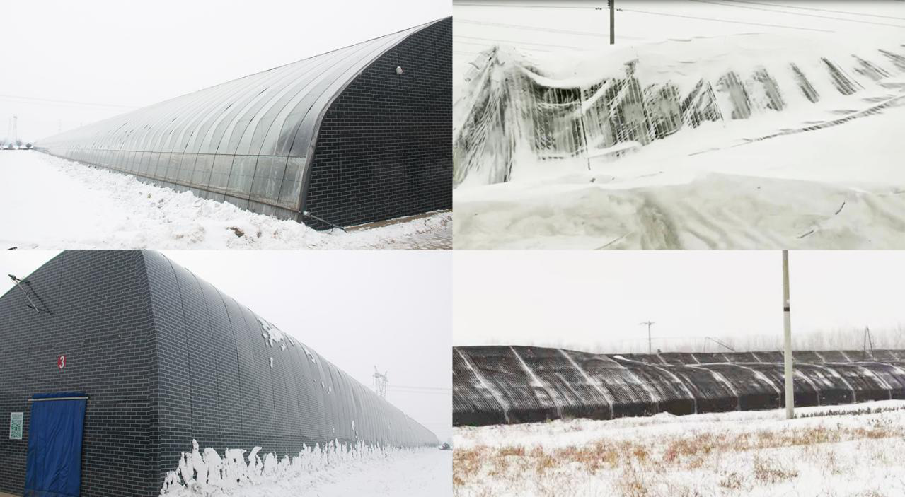在寒冷的冬季里,若遇到突如襲來的降雪或狂風,北方高寒地區(qū)設施農(nóng)業(yè)生產(chǎn)將會受到嚴重影響,北方多數(shù)溫室因為積雪和狂風導致坍塌,而這時水蓄熱內保溫裝配式日光溫室表現(xiàn)出強勁的使用性能。圖一為水蓄熱內保溫裝配式日光溫室,內保溫被正常卷起,落在溫室棚膜上的積雪自動滑落,不影響設施使用及作物生長。圖二為普通外保溫溫室,外保溫被積雪,不能卷起,設施承重增加,多半溫室被積雪壓塌,嚴重壓傷農(nóng)作物,同時溫室內無光照,無法積溫及進行作物生長。