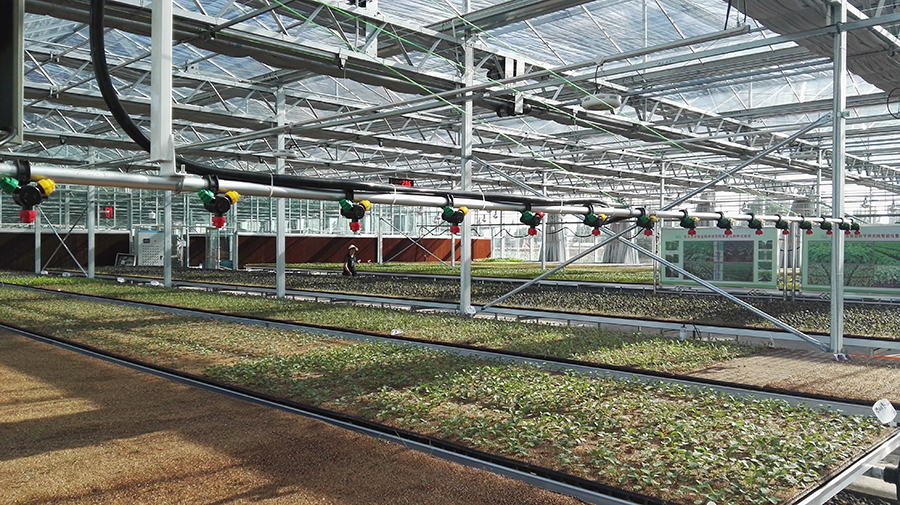 蔬菜集約化育苗裝備及技術(shù)采用配套苗床、軌道式噴灌系統(tǒng)、環(huán)流系統(tǒng)、優(yōu)質(zhì)基質(zhì)、補(bǔ)光系統(tǒng)等設(shè)施設(shè)備,并通過嚴(yán)格的溫濕光系統(tǒng)環(huán)境控制從而達(dá)到育苗生產(chǎn)的標(biāo)準(zhǔn)化、產(chǎn)業(yè)化生產(chǎn)。